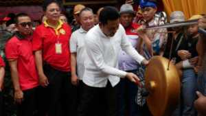 Bupati Sidoarjo Subandi memukul gong didampingi anggota DPRD Sidoarjo asal Krian M. Nizar saat pemberangkatan Kirab Budaya di Klenteng Tri Dharma Teng Swie Bio. (Foto: METRTO TODAY)