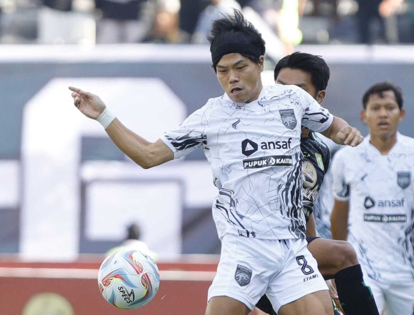 PENENTU HASIL: Gelandang Borneo FC Kei Hirose mencetak gol tunggal yang berbuah kemenangan timnya atas tuan rumah Dewa United di lanjutan Liga 1 Senin malam (10/3). (Liga Indonesia)