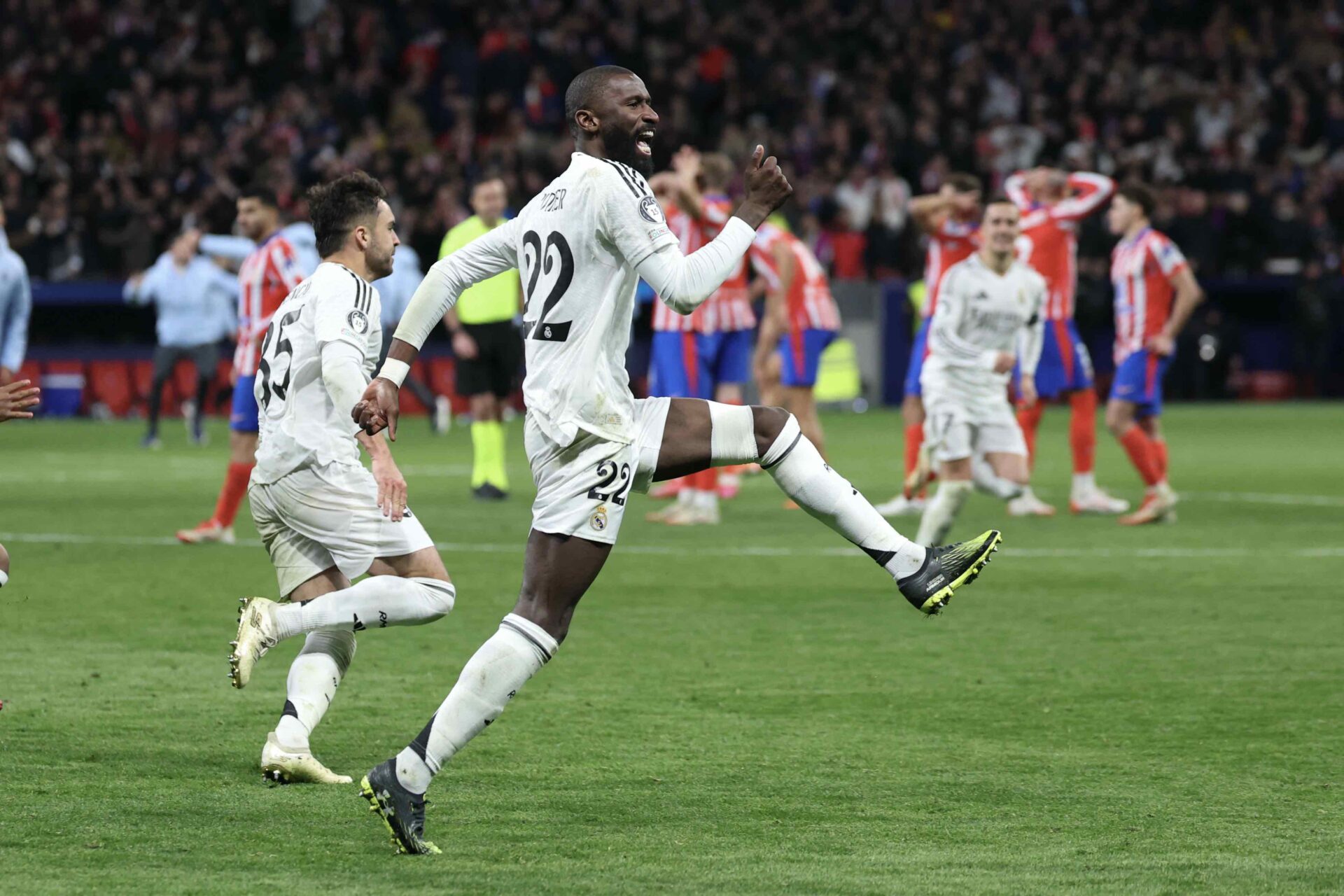 PENALTI TERAKHIR: Bek Real Madrid Antonio Rudiger merayakan keberhasilan menjalankan tugasnya mengeksekusi penalti di Metropolitano, Madrid, 13 Maret. (UEFA)