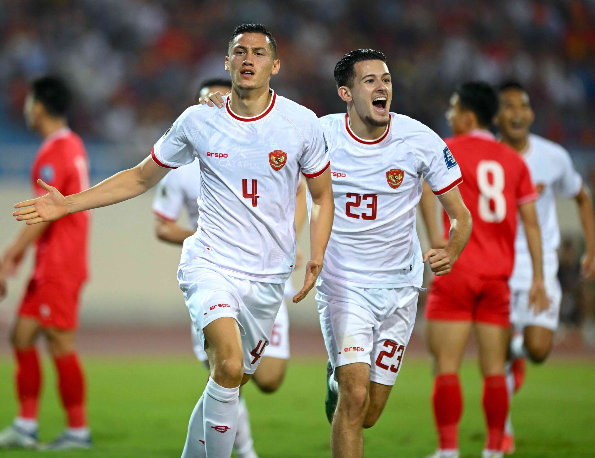 KAYA PENGALAMAN : Pemain timnas Indonesia Jay Idzes (kiri) dan Justin Hubner dalam laga melawan Vietnam di babak kedua Kualifikasi Piala Dunia 2026 Zona Asia, Maret 2023. (Foto: Istimewa)
