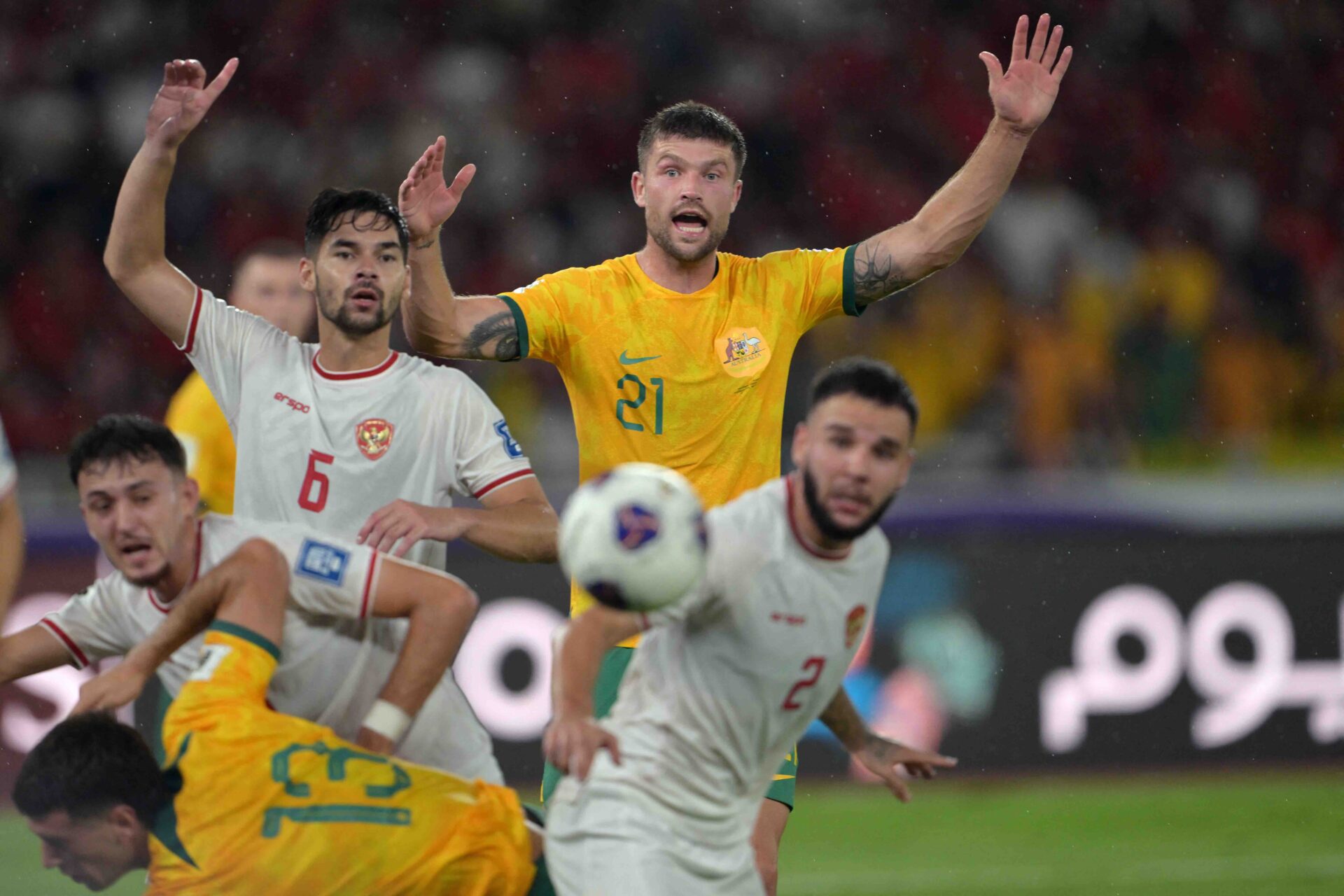 UJIAN BERAT: Pemain timnas Indonesia dan Australia berduel di babak ketiga Kualifikasi Piala Dunia 2026 Zona Asia di Stadion Utama Gelora Bung Karno, Jakarta, Oktober 2024. (AFC/FIFA)