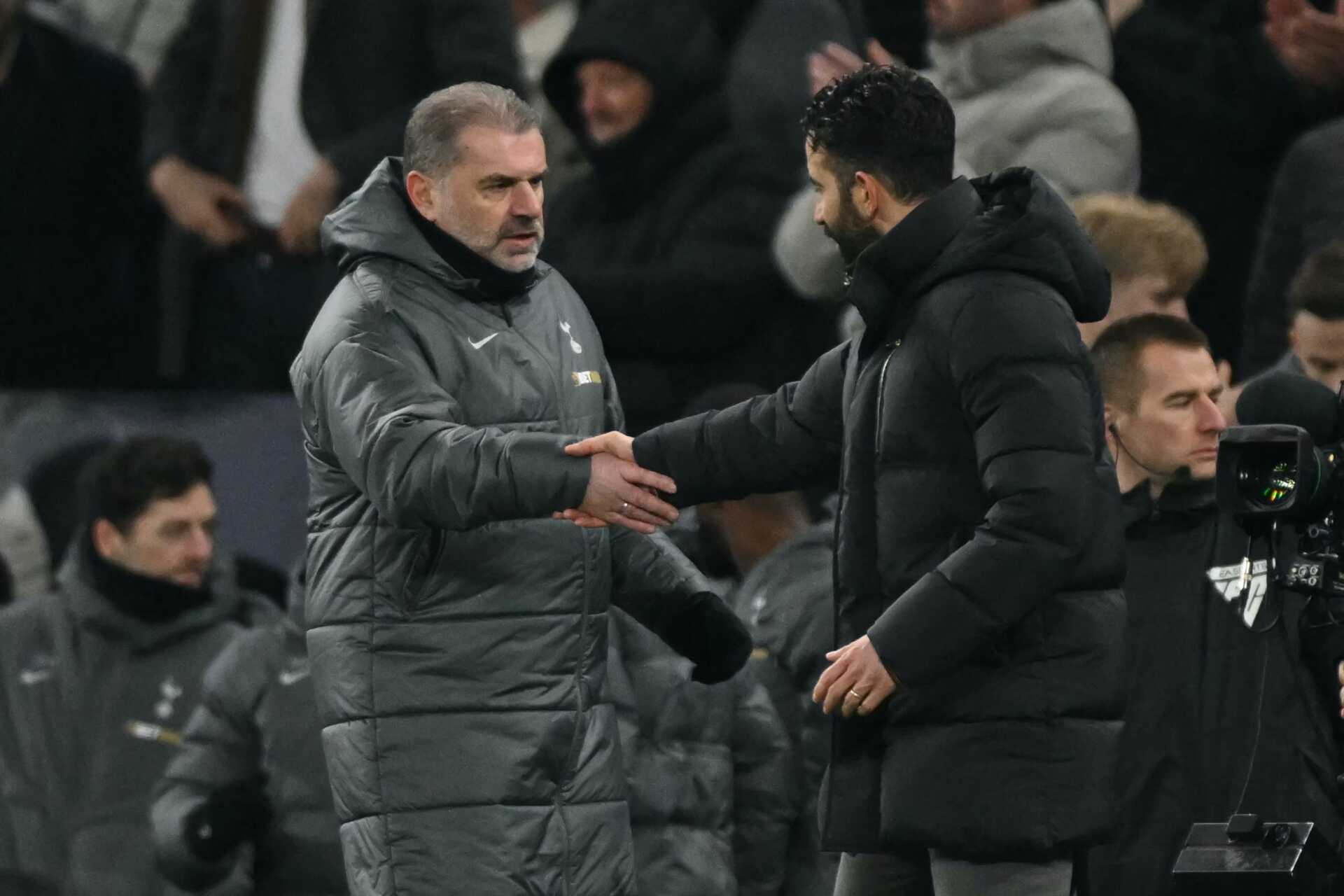 Pelatih Spurs Ange Pestecoglou (kiri) bersama Pelatih United Ruben Amorim Februari lalu. (Premier League)