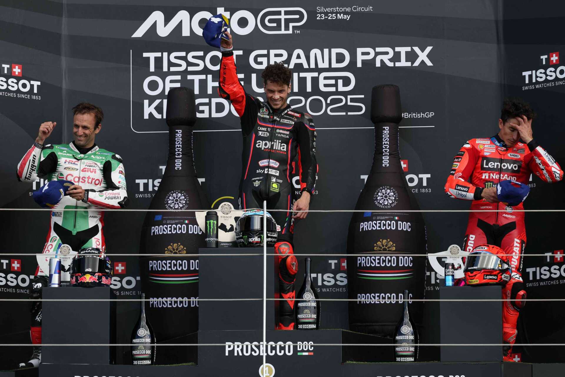 Pembalap Aprilia Marco Bezzecchi diapit Johann Zarco (kiri) dan Marc Marquez di podium MotoGP Inggris Minggu WIB (25/5). (MotoGP)