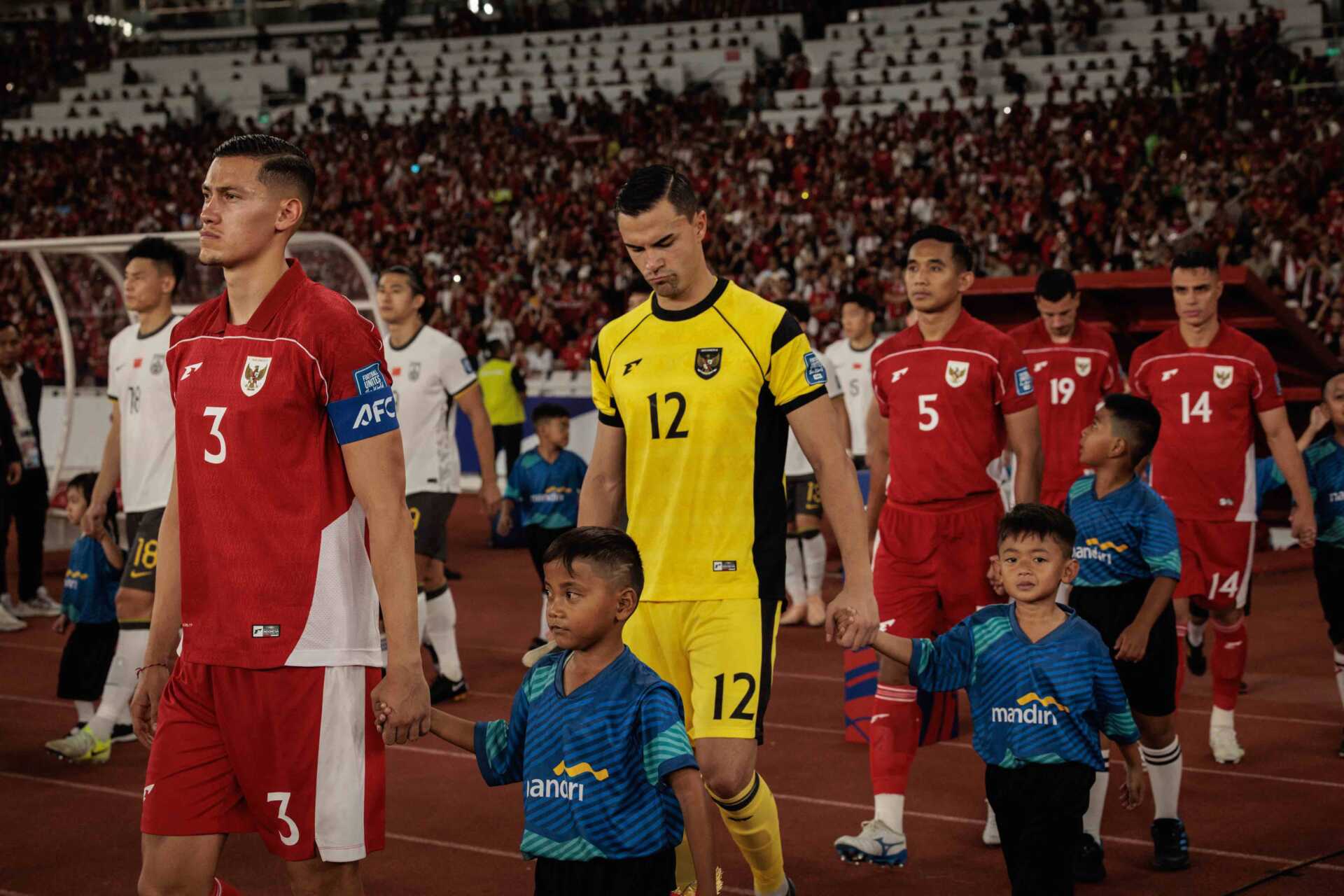 Para pemain Indonesia memasuki lapangan Stadion Utama Gelora Bung Karno (SUGBK) sebelum melawan Tiongkok di kualifikasi Piala Dunia 2026 5 Juni lalu. (AFC)