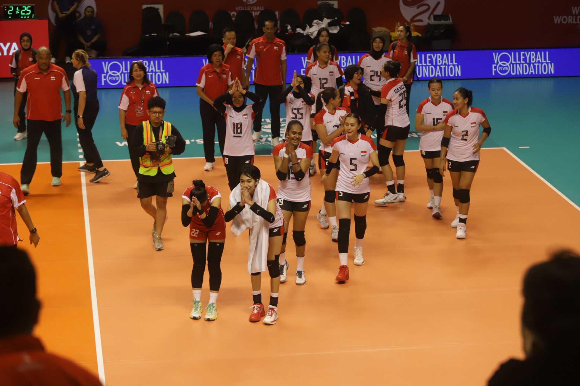 Tim Putri Indonesia U-21 merayakan kemenangan atas Kanada di Jawa Pos Arena, Surabaya, Jumat (8/8). (MetroToday)