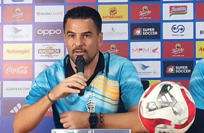 Pelatih Persita Tangerang Carlos Pena saat konferensi pers di GBT jelang laga Sabtu (4/4) melawan tuan rumah Persebaya Surabaya. (Foto: Ahmad/METROTODAY)