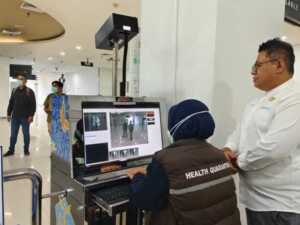 Kepala Balai Besar Kekarantian Kesehatan (BBKK) Rosidi Roslan saat memantau di pintu masuk kedatangan internasional Bandara Juanda. (Foto: istimewa)