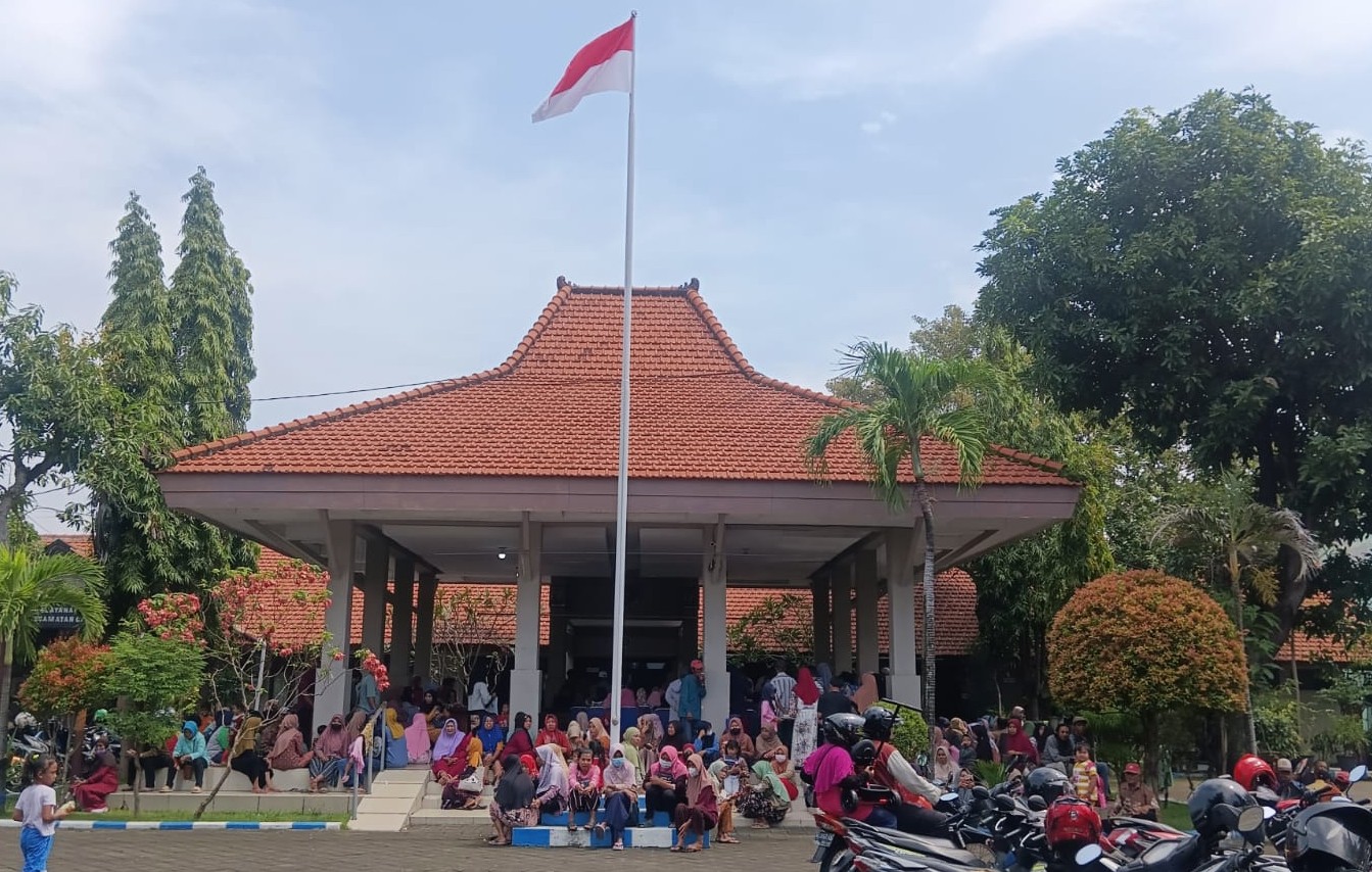 Warga Kecamatan Candi sedang antre menunggu giliran dapat bantuan uang PKH di bawah Bendera Merah Putih pada Kamis (27 Februari 2025). (Foto: Dokumen Metro Today)