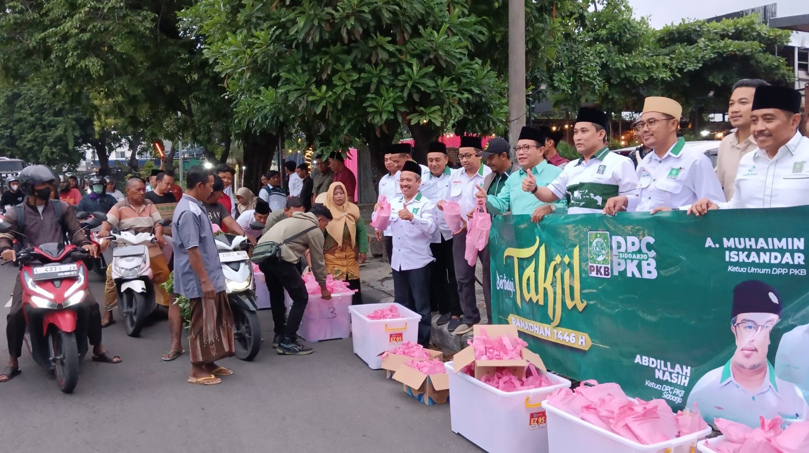 Bagi-bagi takjil Dewan Pengurus Cabang Partai Kebangkitan Bangsa (DPC PKB) Sidoarjo berlangsung di Jalan Soenandar Priyo Sudarmo, Sidoarjo. Tak jauh dari kantor DPC PKB Sidoarjo di Jalan Erlangga. Total ada 500 paket takjil yang dibagi.