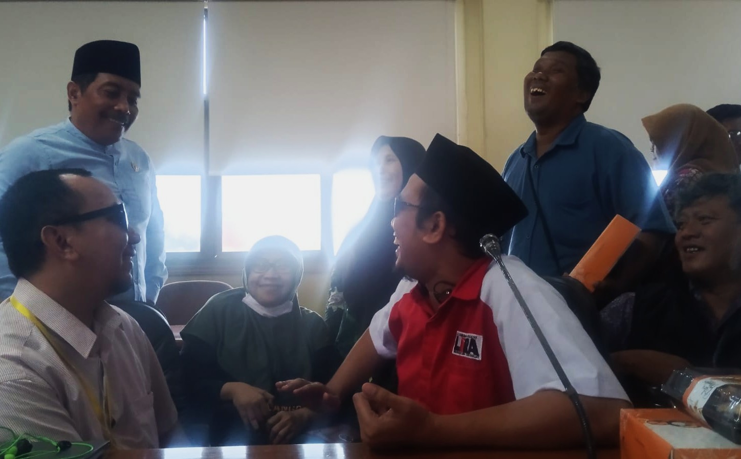Ketua Komisi D DPRD Sidoarjo Dhamroni Chudlori berbincang dengan para penyandang disabilitas setelah hearing di DPRD Sidoarjo selesai. (Foto: METROTODAY)