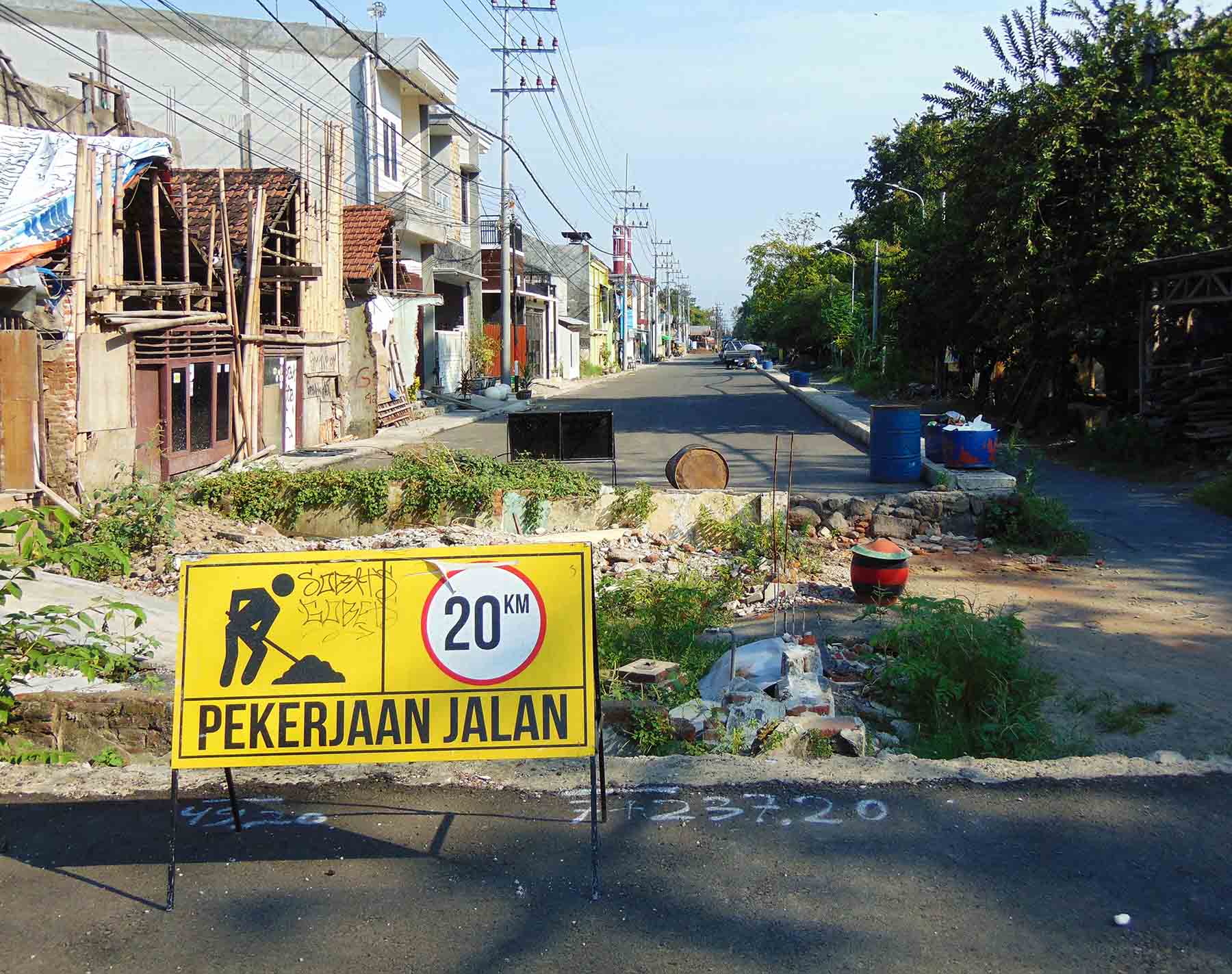 Aspal sudah terbentang mulus. Dari perempatan Jalan Lingkar Timur mengarah ke depan PT Japfa Comfeed Indonesia. Namun, itu terputus. Lubang menganga di tengah jalan. Persis di depan sebuah rumah yang bangunannya mulai ambrol.