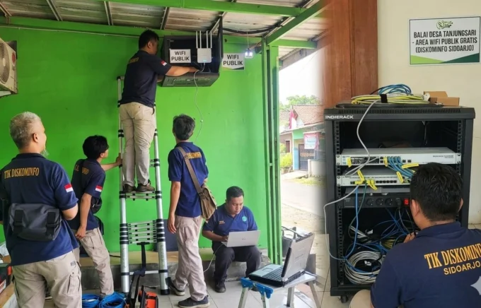 Teknisi dan staf dari Dinas Komunikasi dan Informatika (Diskominfo) Kabupaten Sidoarjo memasang infrastruktur WiFi publik gratis di Desa Tanjungsari, Kecamatan Jabon. (Foto: Kominfo Sidoarjo)