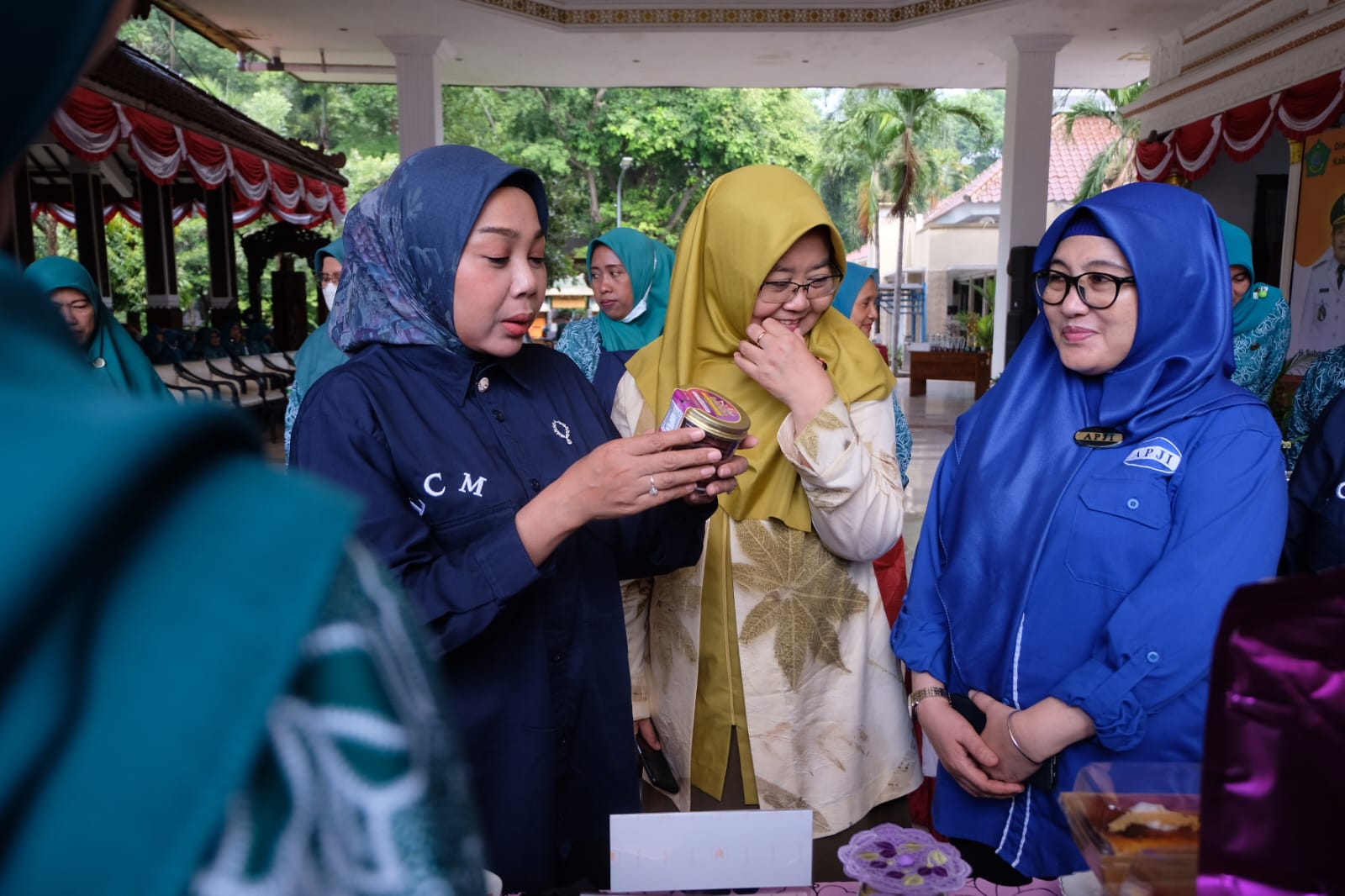 Ketua PKK Kabupaten Sidoarjo dr Hj Sriatun Subandi mengamati salah satu produk makanan olahan peserta lomba masak di Pendopo Delta Wibawa pada Rabu, 26 Februari 2025. (Foto: Dinas Kominfo Sidoarjo)