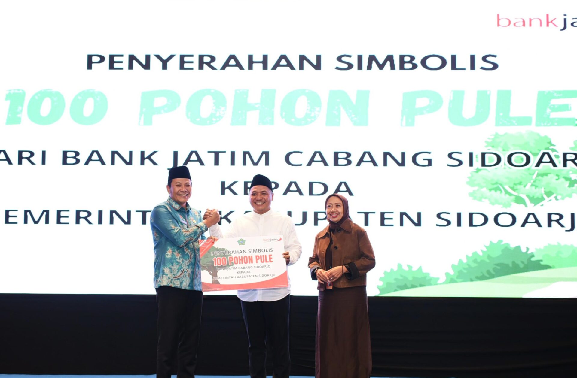 Bupati Sidoarjo Subandi menerima secara simbolis bantuan pohon pule untuk taman kota Sidoarjo dari Kepala Cabang Bank Jatim Sidoarjo Suyatno dan Direktur Kepatuhan Bank Jatim Umi Rodiyah. (Foto: Kominfo Sidoarjo)