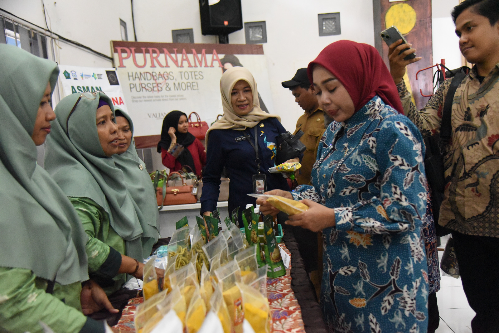 Ketua TP PKK Sidoarjo Sriatun Subandi melihat produk-produk karya wanita Sidoarjo di Pendopo Delta Wibawa pada Senin (28 April 2025). (Foto: Rahayu Kominfo Sidoarjo)