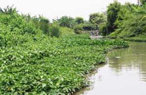 Tanaman enceng gondok yang tumbuh liar membuat Sungai Mbah Gepuk menyempit dan menyulitkan laju perahu nelayan. (MT)
