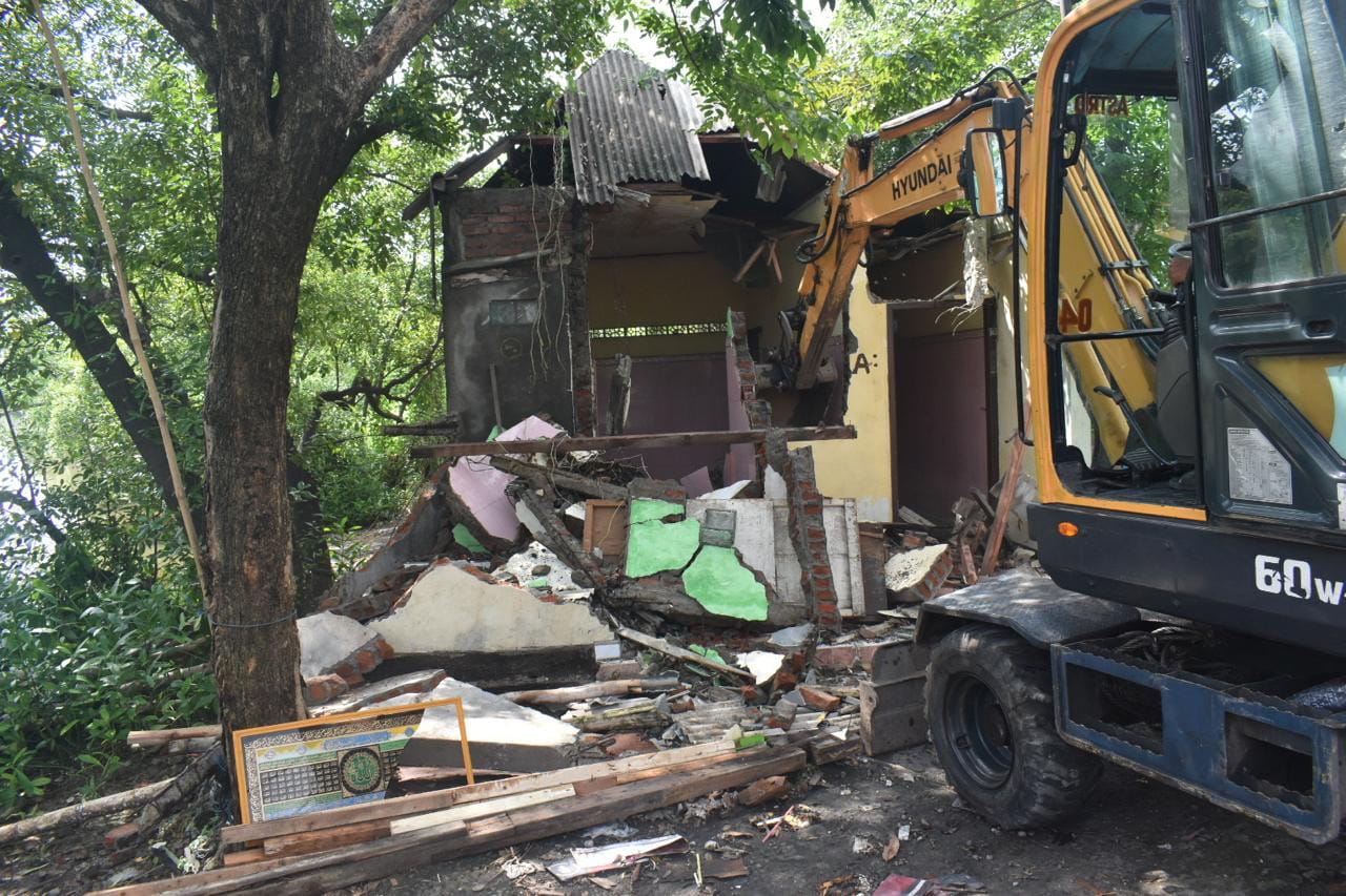 Sebanyak 13 bangunan liar yang berdiri di sempadan Sungai Lamong, Kecamatan Benowo, akhirnya dibongkar, Jumat (16/5).