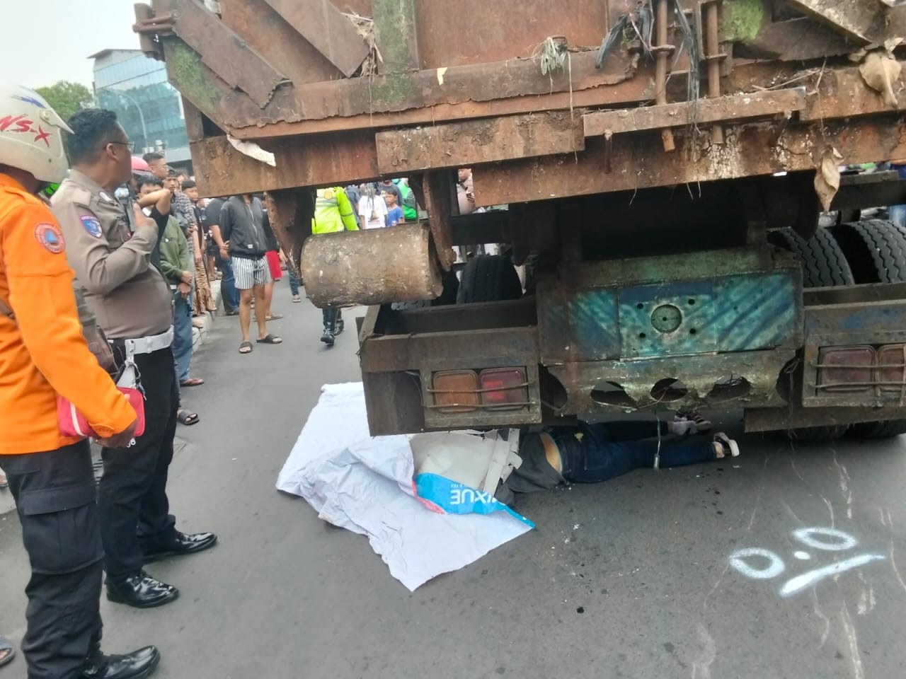 Polisi mengamankan laka lantas yang terjadi di Jalan Kranggan yang menyebabkan seorang pengemudi tewas terlindas truk sampah. (Foto: Istimewa)