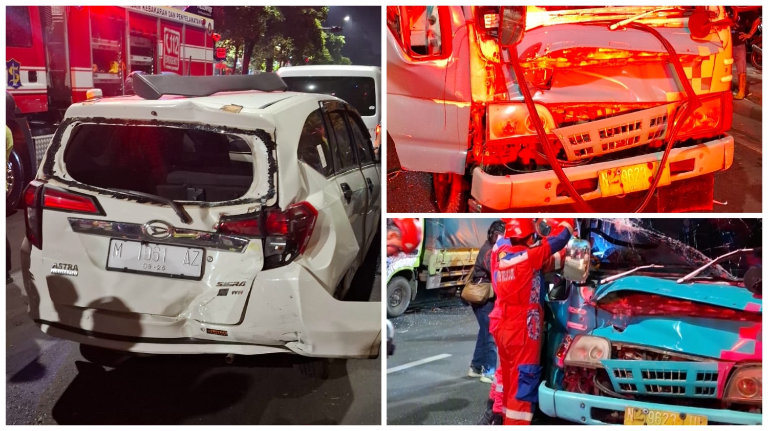 Kecelakaan tersebut melibatkan empat pengemudi yakni Tulus Kusbandono, 40, (GrandMax L 1498 LJ), Hasbollah KS, 33, (Daihatsu Sigra M 1061 AZ), Angga Luhung Pambudi, 30, (Truk Hino Hijau W 9956 PG), dan Mahfud Al Hafid, 29, (Truk Mitsubishi Fuso N 9623 JL).