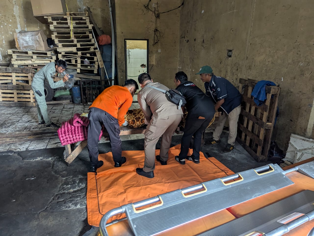 Jenazah seorang pria diperkirakan berusia 60 tahun ditemukan sekitar pukul 09.33 WIB di dalam gudang yang kosong.