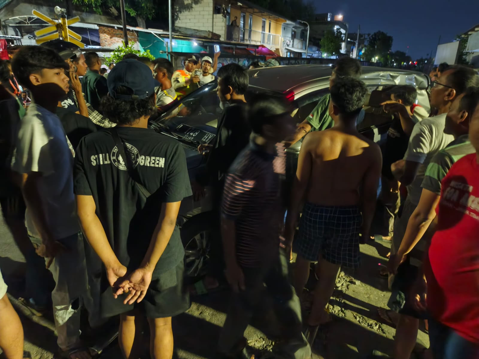 Warga berkerumun usai sebuah mobil ditemper KA Penataran di perlintasan Ngagel Surabaya. (Foto: Istimewa)