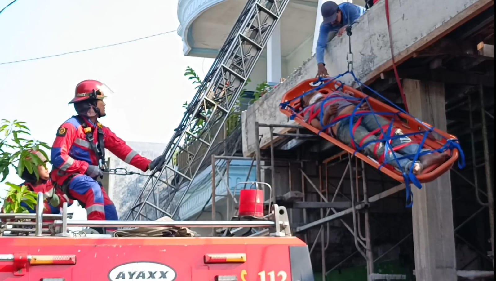 Petugas mengevakuasi tubuh Juni Saadin dari lantai dua bangunan yang sedang dikerjakannya di kawasan Semampir AWS Surabaya. (Foto: Istimewa)