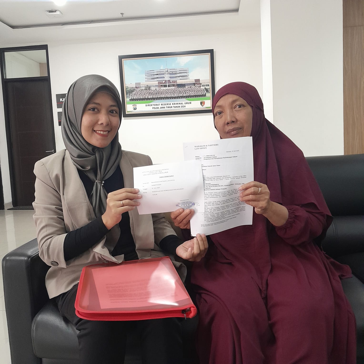 Pengacara Maharani Roya Ananta dan kliennya, Bariyah, setelah melapor ke Direktorat Reserse Kriminal Umum (Ditreskrimum) Polda Jawa Timur di Jalan A. Yani, Surabaya, pada Kamis (24 Juli 2025). (Foto: METROTODAY)
