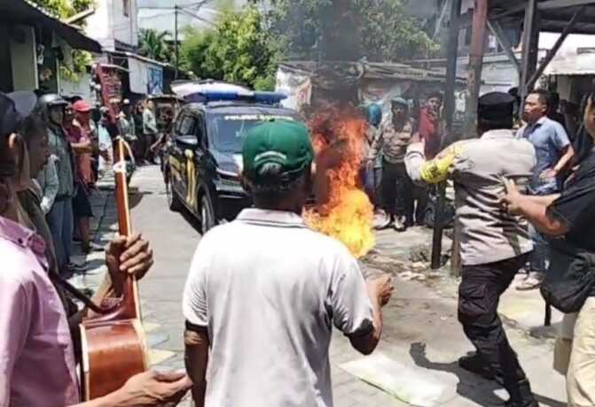 Kejadian mencapai puncaknya ketika api tiba-tiba menyambar tubuh pelaku. “Saya lihat sendiri, kayaknya ada yang nyiram bensin sebelum kejadian itu,” ujar Yanto, salah satu warga.