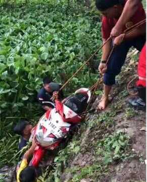 Sebuah sepeda motor milik pemancing tiba-tiba terperosok ke dalam waduk saat tengah memancing sembari duduk diatas sepeda motor.
