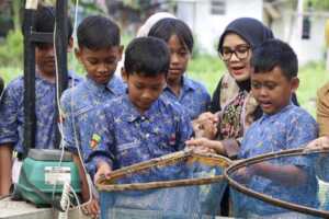 Ketua Forum Peningkatan Konsumsi Ikan (Forikan) Kota Surabaya, Rini Indriyani, turut hadir dan mengajak para siswa untuk memanen berbagai jenis ikan air tawar.