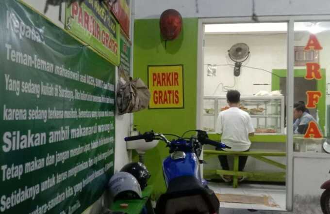 Di depan warung sudah dipasang banner berwarna hijau bertuliskan putih dengan ajakan makan bagi mahasiswa dari Sumut, Sumbar, dan Aceh, yang belum mendapatkan kiriman dari keluarga.