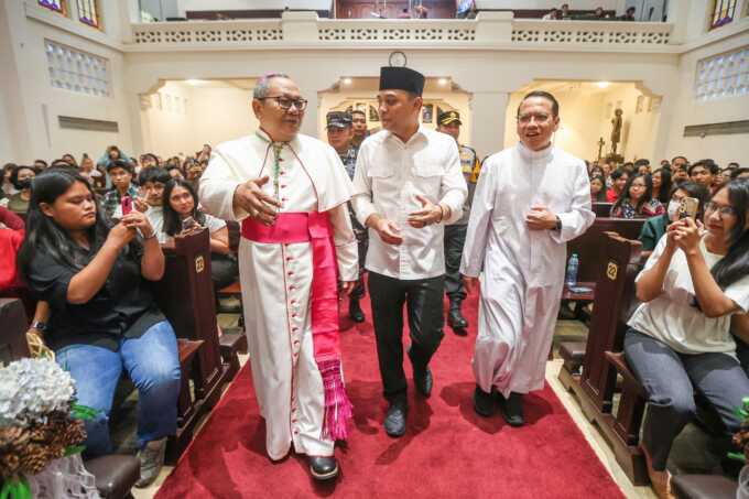 Di hadapan para jemaat, pendeta, dan uskup, Wali Kota yang akrab disapa Cak Eri menitipkan doa agar kota ini terjaga dari marabahaya dan perpecahan.