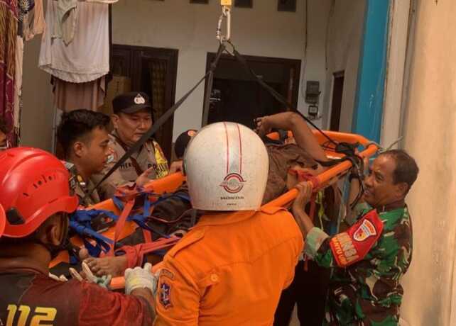 “Korban kemudian dievakuasi dari atap bangunan lantai 2 ke lantai dasar menggunakan sistem lowering (menurunkan korban dengan tandu) oleh tim Rescue gabungan,” jelasnya