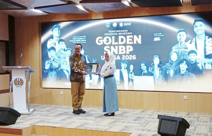METROTODAY, SURABAYA – Sebanyak 25 calon mahasiswa baru Universitas Negeri Surabaya (Unesa) mendapatkan kehormatan khusus berupa beasiswa Golden SNBP tahun 2026. Penyerahan beasiswa dilakukan langsung di ruang theater gedung rektorat Unesa, Kamis (2/4).